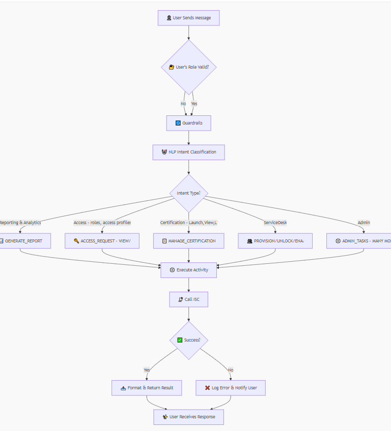 Users type a simple command in chat (example: “Run uncorrelated accounts report from past 30 days?” or “Launch Campaigns” or "Set "Entitlement owners for a source" etc..,).