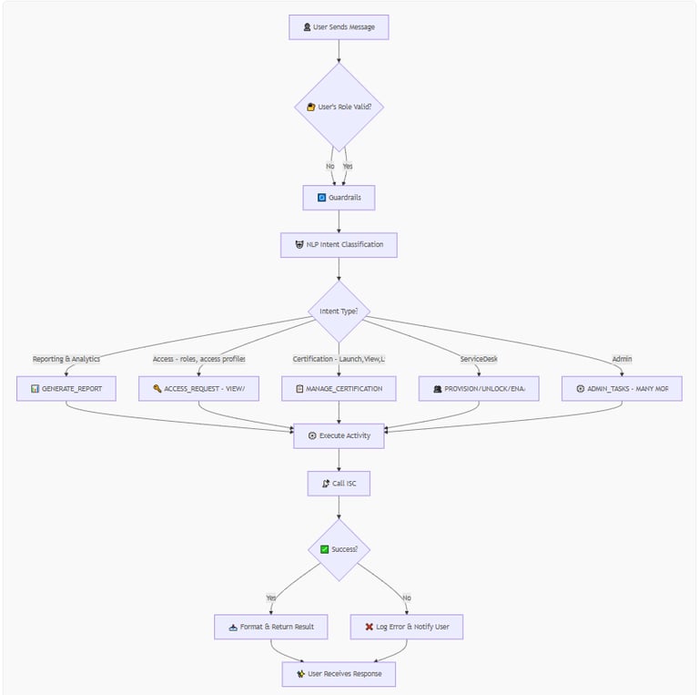 IGA-AI securely interprets natural language requests, orchestrates actions, and executes governed operations using SailPoint ISC APIs — without bypassing existing policies, approvals, or audit controls.